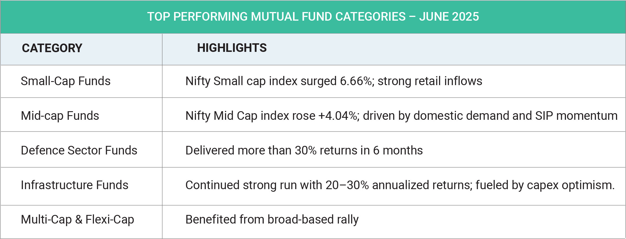 In June 2025, the Indian mutual fund industry saw a standout performance from defence sector funds, which surged up to 39% over the past three months. This rally was fuelled by increased government defence spending, policy support under Make in India and Atmanirbhar Bharat, and rising geopolitical tensions. The sharp rise in these funds signalled a growing investor shift toward thematic investments and highlighted how policy changes and global events can swiftly influence fund flows and shape market sentiment in India At the Moneycontrol Mutual Fund Summit 2025, the remarkable growth and evolving dynamics of India’s mutual fund industry over the past five years were prominently highlighted. The industry’s assets under management (AUM) soared from ₹24.55 trillion in 2020 to ₹72.20 trillion in 2025, nearly tripling in size—underscoring a significant rise in investor participation and confidence. Monthly Systematic Investment Plan (SIP) inflows also saw impressive growth, climbing from ₹3,000 crore a decade ago to ₹26,688 crore in 2025. This sharp increase reflects a strong and sustained shift toward disciplined, long-term investing, particularly among retail investors across the country. Retail participation expanded significantly, with the number of folios reaching 23.4 crore and retail investors’ share in AUM rising from 23% to 28%. Smaller towns (B-30 cities) played a pivotal role, doubling their AUM contribution from 9% to 18.4%, signalling deepening financial inclusion. A wave of product innovation also reshaped the market, with thematic and sectoral funds—particularly in defence, technology, and equal-weight strategies—gaining popularity. This reflected the market’s maturity and growing appetite for targeted investment solutions. Regulatory efforts by SEBI were instrumental in strengthening transparency and investor protection. With robust disclosures, enhanced investor education, and clear governance, the Indian mutual fund industry closed June 2025 on a historic high, poised for sustainable growth ahead. The Indian mutual fund industry in June 2025 demonstrated strong growth, record AUM, and high SIP inflows, with sectoral and thematic funds—especially in defence—gaining traction, even as some categories like small cap and pharma saw short-term underperformance. The expansion was driven by increased retail participation, product innovation, and supportive regulatory and economic conditions.