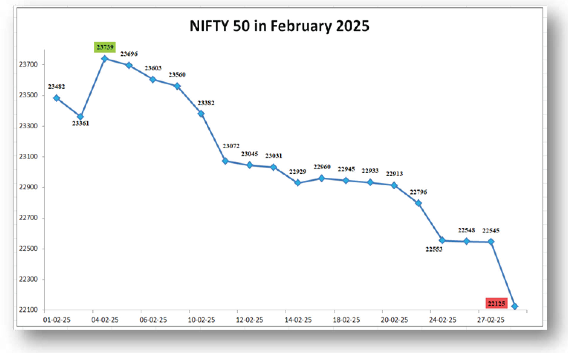 of only 0.82%. This decline was majorly driven by global economic worries, foreign investors pulling out funds, and disappointing corporate results. Small and mid-cap stocks faced heavy selling pressure. On February 28, 2025, the Indian equity market saw a massive erosion of ₹8.2 lakh crore in market capitalization as the Sensex plummeted by 1,414 points to close at 73,198.10, and the Nifty fell by 420 points to 22,124.70. From January down 1,471.16 points (1.97%). Meanwhile, the Nifty 50 extended its losses for the eighth consecutive session, dropping 420.35 points (1.86%) to settle at 22,124.70. Overall, both indices declined by 6% in February. Looking at the sectoral performance, Nifty IT Index suffered the steepest drop, falling by 4.18%, Nifty Auto Index declined by 3.92%, Nifty FMCG Index dropped by 2.62%, and lastly Nifty Bank Index showed some resilience with a decline to February 2025, the total market capitalization of listed companies on the Sensex fell from approximately ₹445 lakh crore to ₹393 lakh crore, resulting in a loss of over ₹50 lakh crore in market capitalization over the first two months of 2025. Thus, while the total erosion from January to February was over ₹50 lakh crore, the specific erosion in February was highlighted by a significant drop of ₹8.2 lakh crore on the last trading day of the month.
