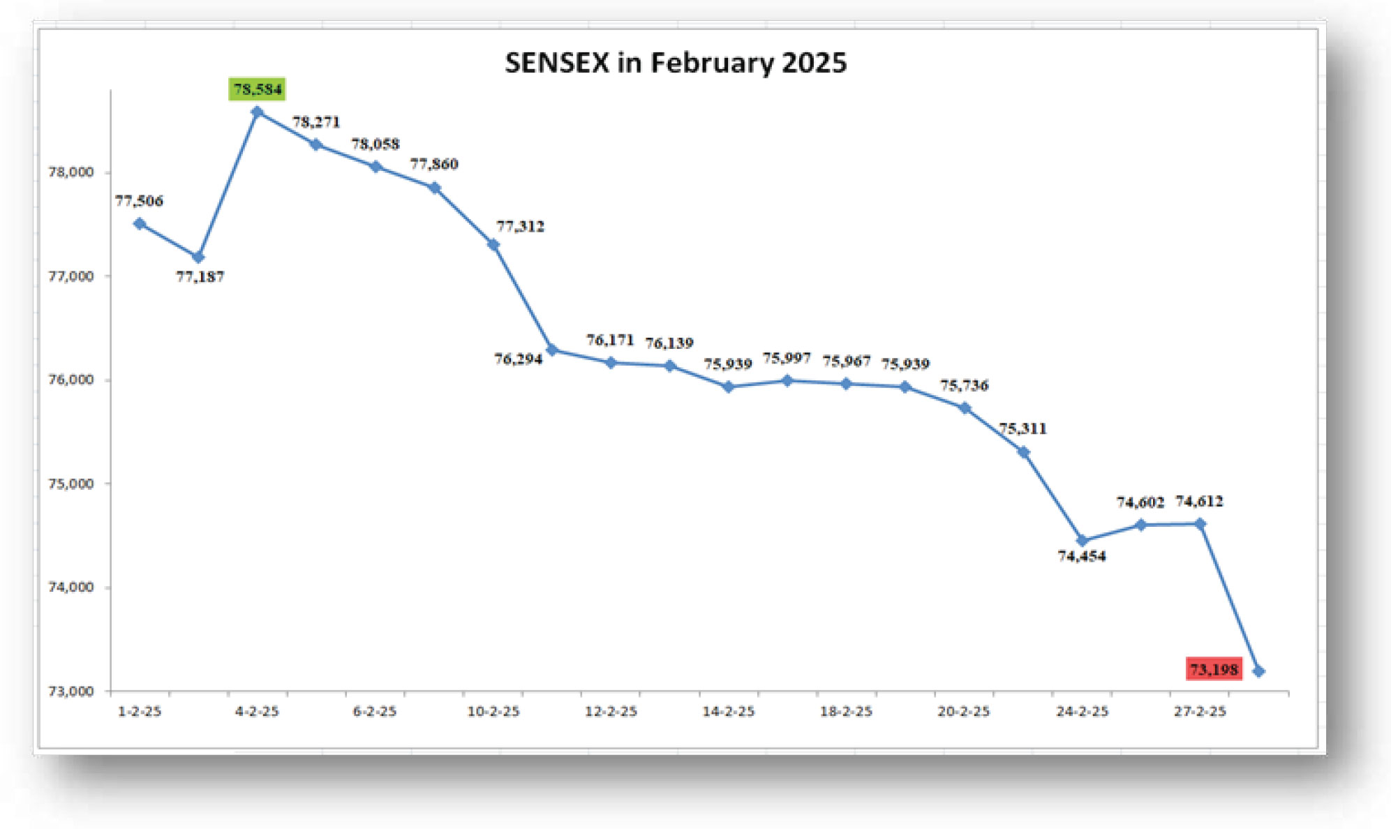 India’s stock market faced a sharp downturn on last day of February 2025, as the Sensex and Nifty 50 recorded their worst single-day decline in nearly five months. The NSE benchmark also marked its longest monthly losing streak in 29 years (since 1996), driven by heavy foreign capital outflows amid concerns over U.S. tariffs. The BSE Sensex plunged 1,414.33 points (1.90%) to close at 73,198.10, after hitting an intraday low of 73,141.27,