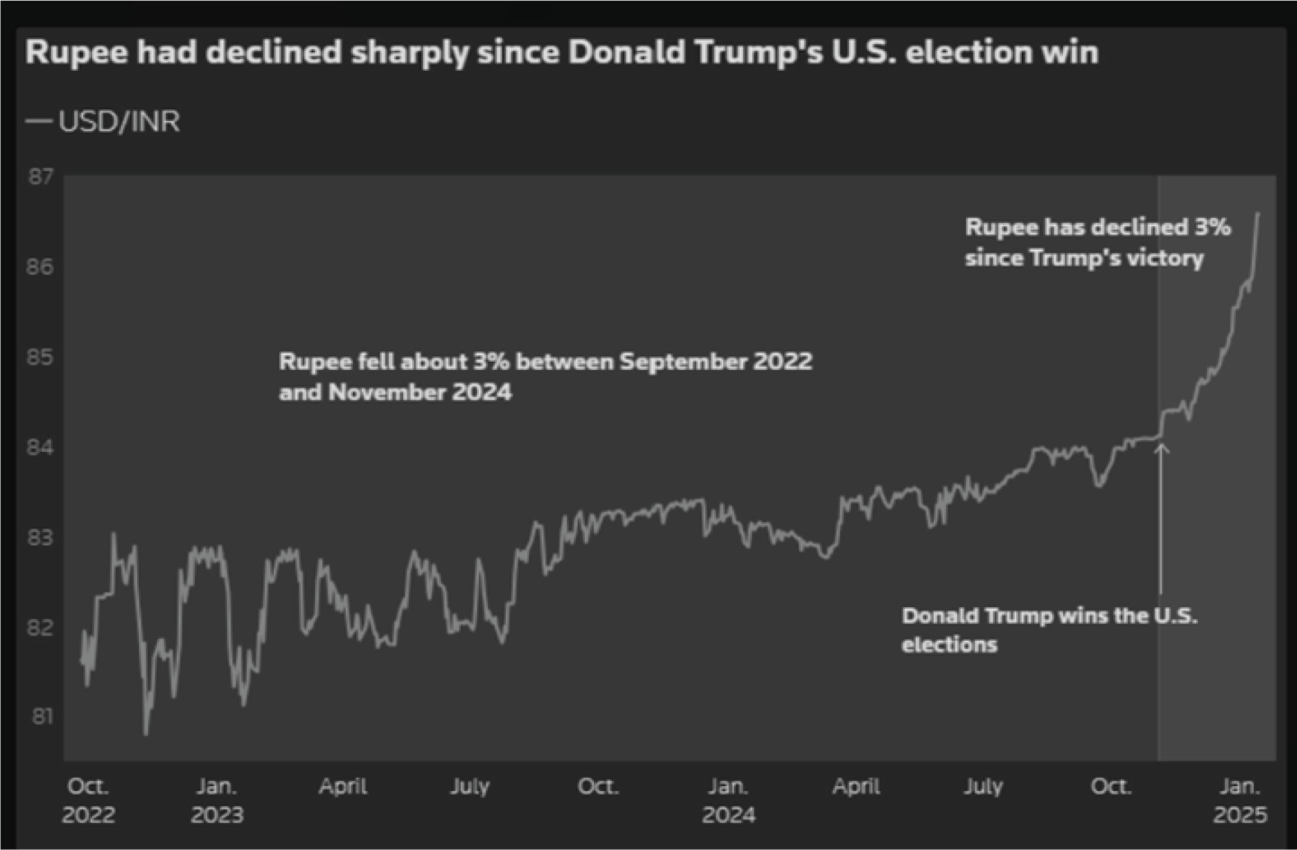 In February 2025, the Indian rupee experienced significant depreciation against the U.S. dollar, reaching an all-time low of ₹88.10 in early February, its weakest level ever. By the end of the month, the rupee had recovered slightly, trading at approximately ₹87.37 per USD, but still marking its fifth consecutive monthly decline. The Indian rupee's depreciation was driven by a combination of global and domestic factors. On the global front, the U.S. Federal Reserve's aggressive interest rate hikes made the U.S. dollar more attractive, leading to capital outflows from emerging markets like India. Geopolitical tensions, particularly the Russia-Ukraine war and trade conflicts, increased global risk aversion, prompting investors to seek safer assets such as the U.S. dollar. Domestically, India's widening trade deficit, fuelled by higher imports of crude oil and essential goods, put additional pressure on the rupee. Slower GDP growth projections and concerns over India's fiscal stability and rising public debt further dampened investor sentiment. Additionally, significant foreign institutional investor (FII) outflows from Indian markets since October 2024 compounded the rupee's weakness. The Reserve Bank of India's decision to allow more flexibility in the rupee's value under Governor Sanjay Malhotra also contributed to the currency's depreciation. Together, these factors led to the rupee's decline in February 2025. The Indian rupee is expected to continue its depreciation trend in March 2025, with potential levels reaching around ₹87 against the U.S. dollar. Key factors influencing the rupee's performance include global economic uncertainties, ongoing trade tensions, and U.S. tariffs, all of which are likely to contribute to volatility in the currency market. Additionally, the Reserve Bank of India's monetary policy decisions and interventions will play a critical role in managing the rupee's fluctuations and mitigating further depreciation