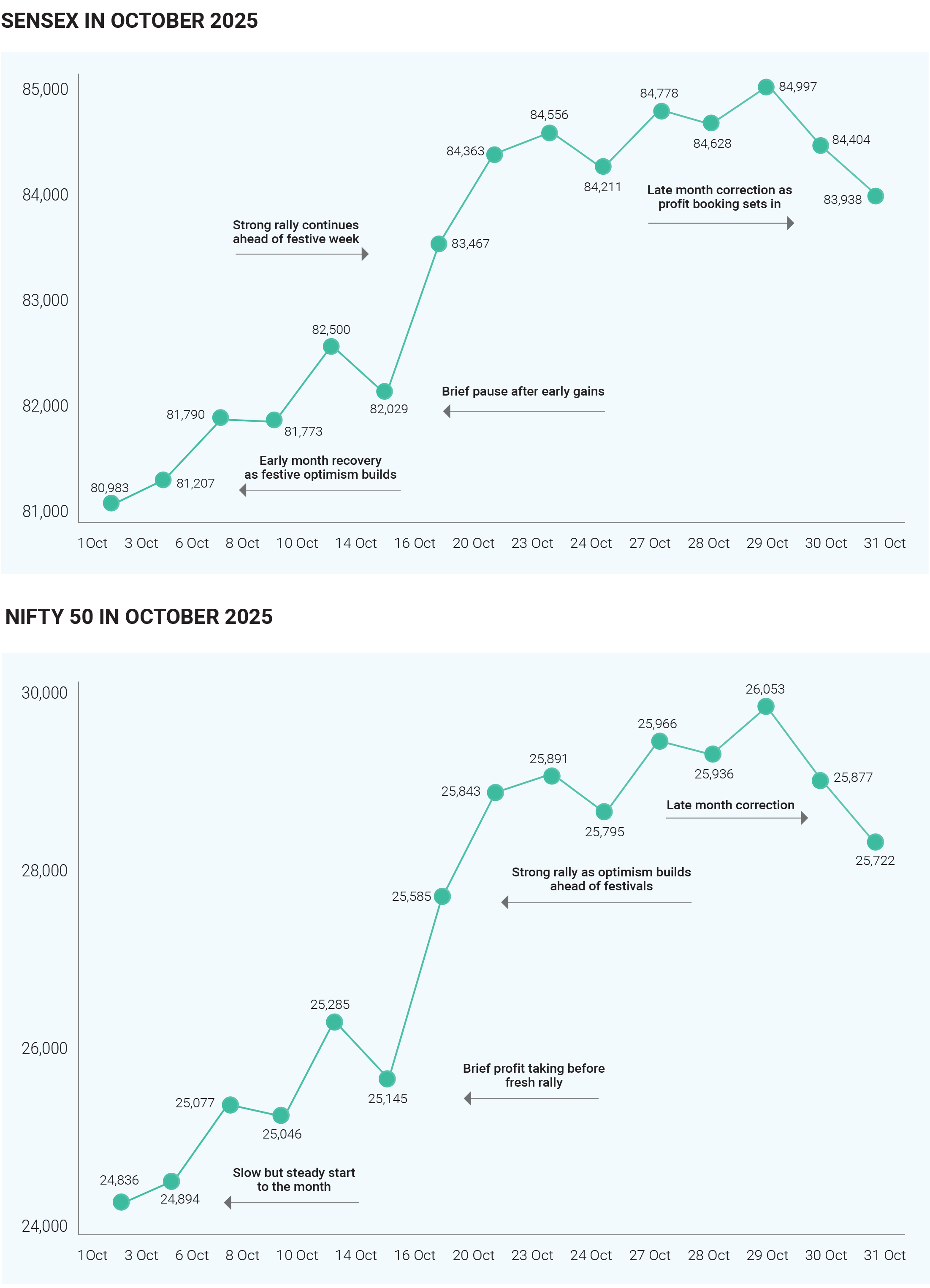 In October 2025, Indian equity markets demonstrated remarkable resilience and strength, with both the Sensex and Nifty registering strong monthly gains despite closing the month on a slightly weaker note. The market’s trajectory was defined by alternating phases of optimism and caution—early enthusiasm fuelled by robust corporate earnings and sustained foreign inflows drove benchmarks to record highs, but profit-booking and global headwinds toward the month’s end triggered a mild pullback. This dual-phase performance captured the complex balance between domestic growth optimism and external vulnerabilities as investors navigated an environment shaped by earnings momentum, regulatory changes, and volatile international By October 31, 2025, the Sensex settled at 83,938.71, down 0.55% for the day, while the Nifty closed at 25,722.10, slipping 0.60%. Despite these end-of-month declines, both indices recorded impressive monthly advances of nearly 5%—their best performance since March 2025. The rally was largely fuelled by strong Q2 FY26 earnings and steady foreign portfolio inflows, particularly into technology, public sector banking, and telecom stocks such as Bharti Airtel, which touched record highs during the period. Midcap and small-cap segments also participated enthusiastically, signalling broad-based investor confidence. However, the market’s upward momentum moderated in the final week as investors opted to lock in profits after sustained gains.